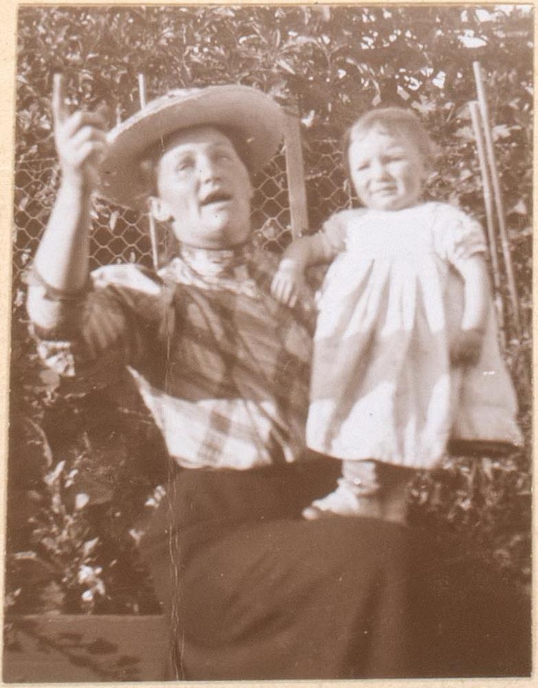 Tekið úti. Kona situr með litla stelpu í fanginu.