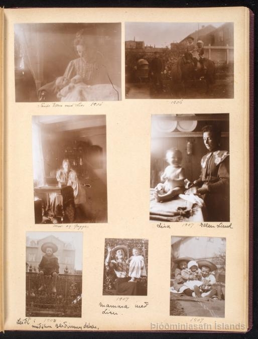 Albúm með 32 spjöldum og innlímdum 132 ljósmyndum, bæði inni- og útimyndum. Skrifaðar skýringar við myndirnar: