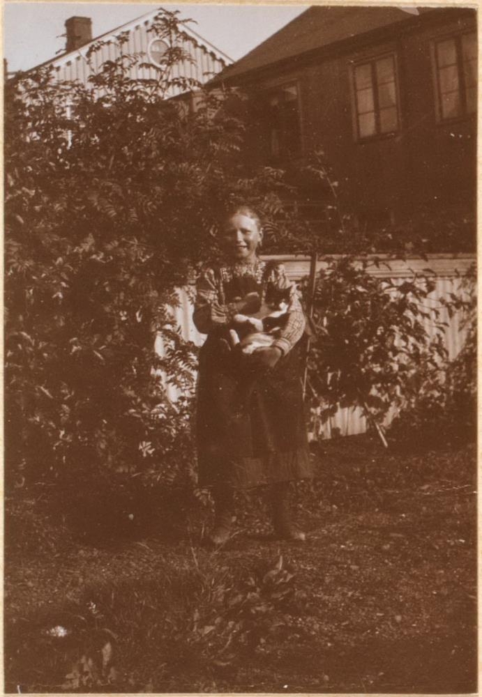 Tekið úti. Stúlka með kött í fanginu úti í garði.