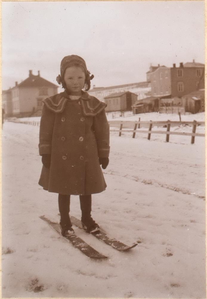 Lítil stelpa stendur á skíðum á götunni. Það er snjór yfir öllu og fjær sér í hús.