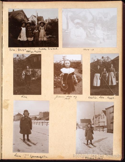 Albúm með 32 spjöldum og innlímdum 132 ljósmyndum, bæði inni- og útimyndum. Skrifaðar skýringar við myndirnar: