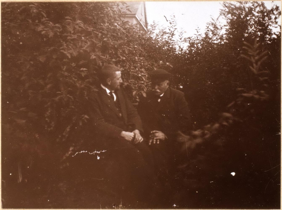 Tekið úti. Tveir karlmenn sitja í húsagarði, mikill trjágróður aftan við þá.