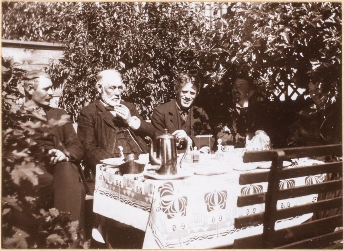 Fjórir karlmenn og ein kona sitja við dúkalagt garðborð og drekka kaffi og spjalla saman, trjágróður allt í kring.