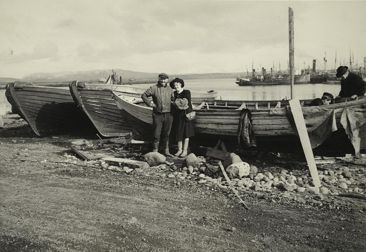 Í mynd eru þrír trébátar sem eru uppá fjörubakka, við lunningunn framarlega á einum þeirra standa karl og kona hlið við hlið, hann í vinnufatnaði, hún í kápu og með hatt. Í hinum enda bátsins eru tveir karlmenn við störf, báðir með hatta á höfði. Í bakgrunni t.h. sjást togarar við bryggju ásamt fleiri skipum, t.v. í bakgrunni sjást fell og fjalllendi.