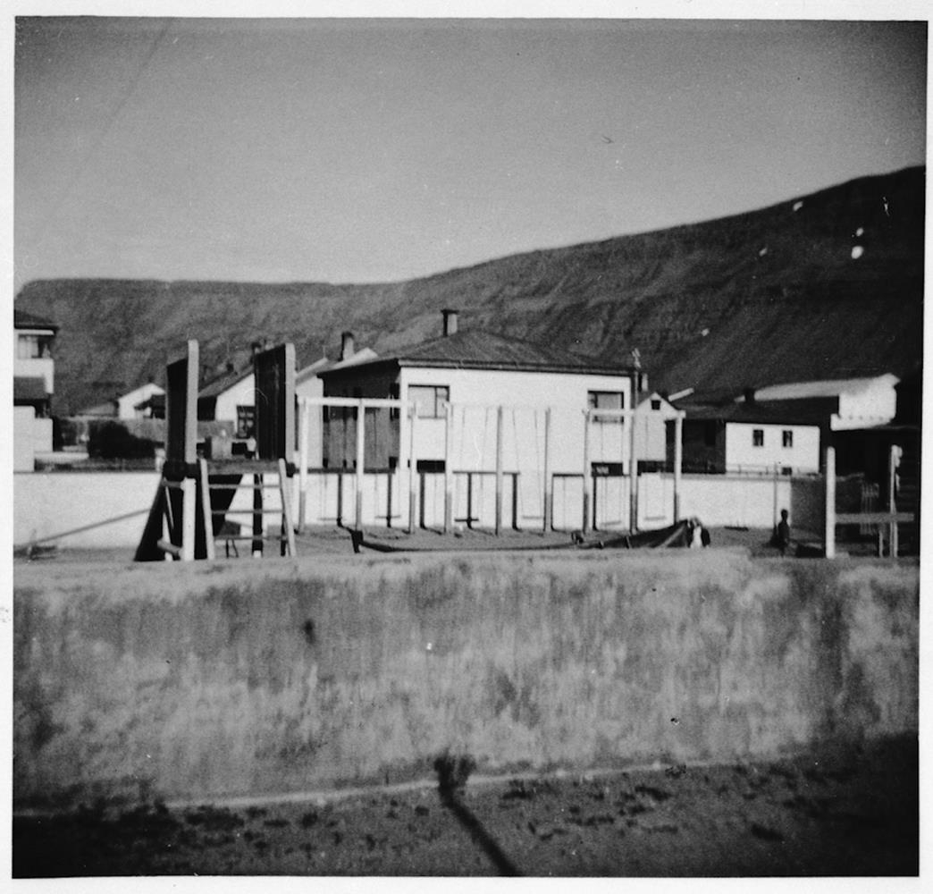 steinsteyptur veggur. Í miðri mynd er leikvöllur með ýmsum leiktækjum.