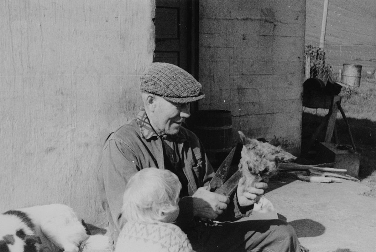 Í forgrunni má sjá bónda munda skæri og heldur hann á haus af lambi. Er hann að snyrta hausinn. Lítið barn hallar sér fram og horfir á. Til vinstri er hundur undir húsvegg að leggja sig. Í baksýn má sjá fótstigið brýni og tunnu. Aftan á stendur: Steinþór og Imba á Hala. 1965.