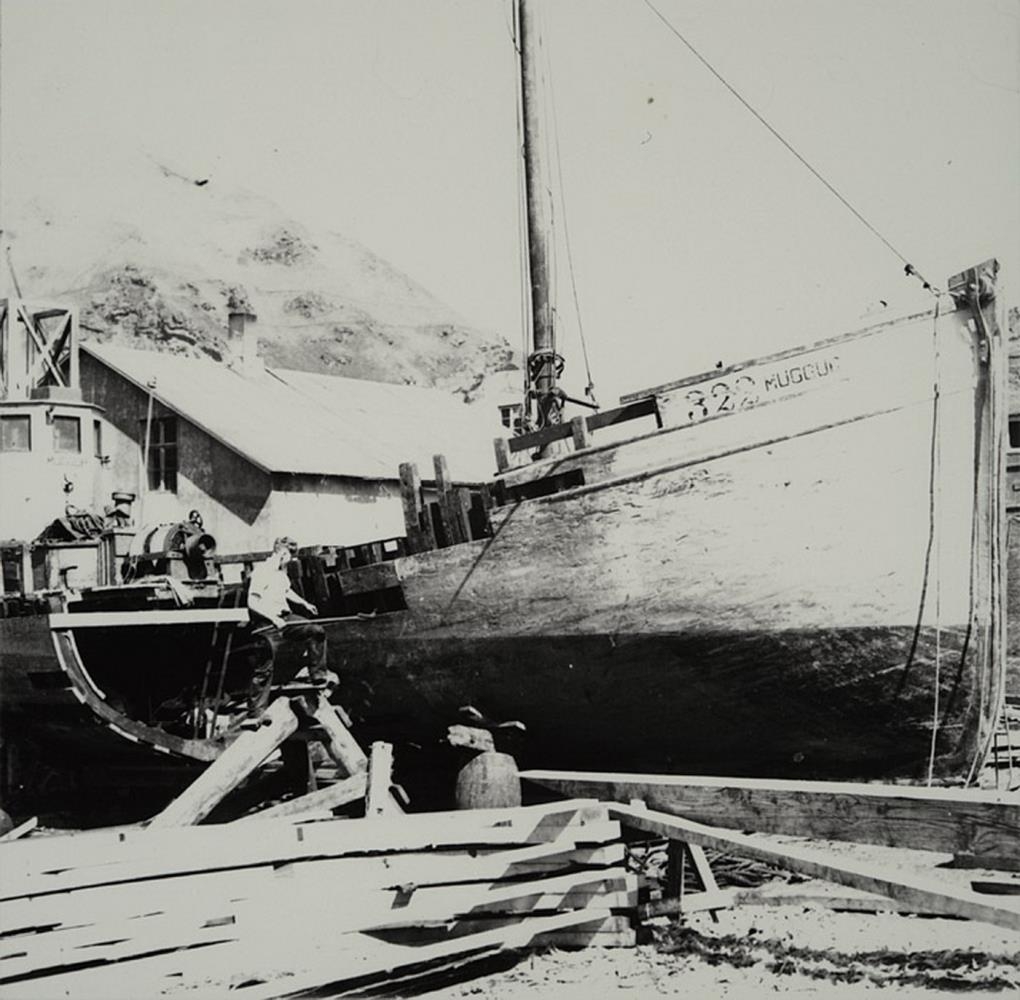 Vélbátur, tréskip, í slipp til lengingar eða viðgerðar. Skipasmiður er að vinna í honum. Á kinnungnum og stýrishúsinu má sjá nafnið: MUGGUR og númerið 322. Hús í baksýn.