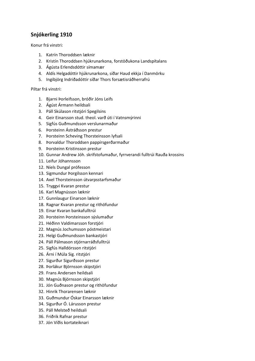 „Þetta er snjókerlingin, febrúar 1910. Á þeim tímum tíðkaðist mjög að draga dár að jafnréttiskröfum kvenna og því var pípan en það þótti ganga kynvillu næst að reykja pípu eða vindil, þ.e.a.s. ef konur gerðu slíkt. Þegar myrkt var orðið laumuðust einhverjir klæmnir unglingar til og settu á kerling [svo] geysistóran penis og því var hún brotin niður, að boði rektors, eldsnemma að morgni næsta dag. Þess má geta að á kvið kerlingar var fest stórt skilti: „Kvenréttindakonan“.“