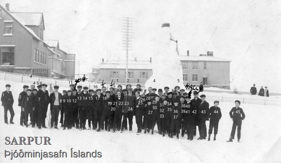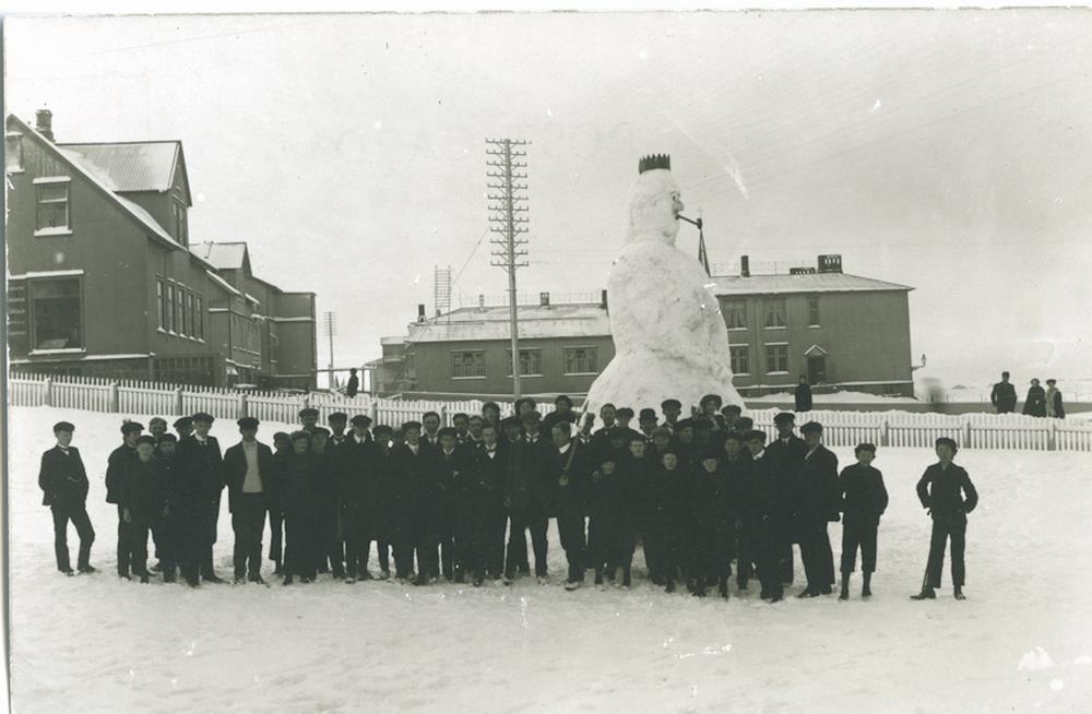Reykjaví/Lækjargata-snjókerling, skólapiltar. Sjá nafnalista og nafnsetningu í Fylgiskjöl undir mynd.