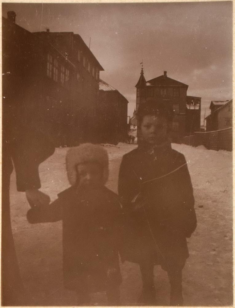 Tveir litlir drengir standa úti í snjónum. Fjær eru hús.