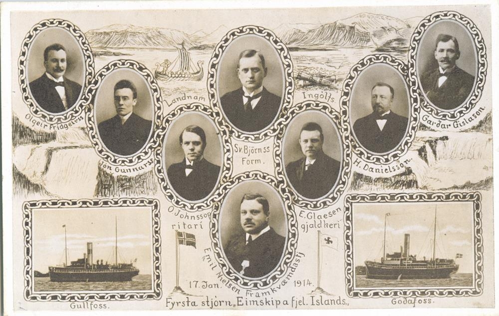 Neðst f. miðju stendur: 17. Jan. 1914. Fyrsta stjórn "Eimskipafjel.
