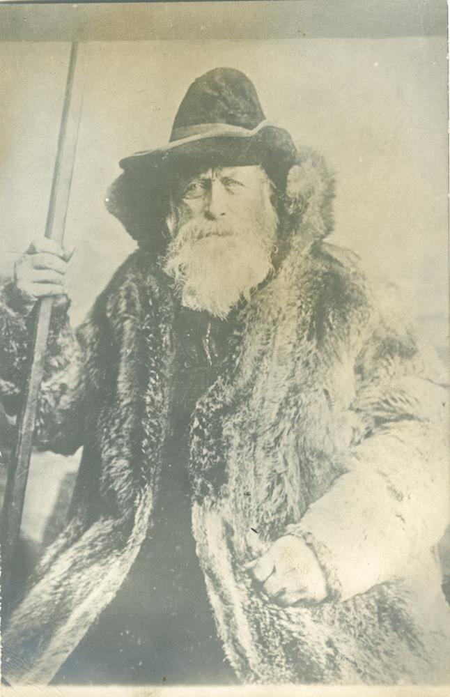 mikið, grátt alskegg og er hann klæddur í loðkápu með háum kraga, með hatt