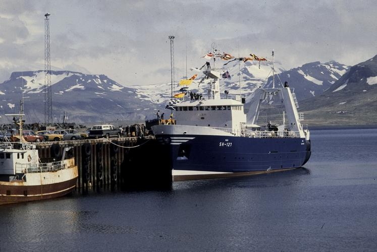 Heildarmynd af fánum skreyttum Má SH-127 við bryggju. Víð mynd. Ljósm: HS. Haust, 1980.