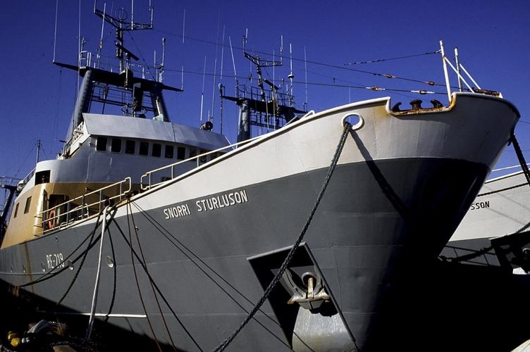 Snorri Sturluson RE-219. Þröng mynd af togaranum við bryggju í Reykjavík. Sér frá stefni aftur eftir skipinu.