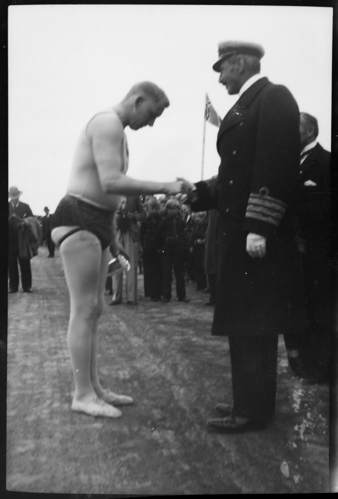 heilsar glímumanni. Fólk fylgist með. Kristján X.