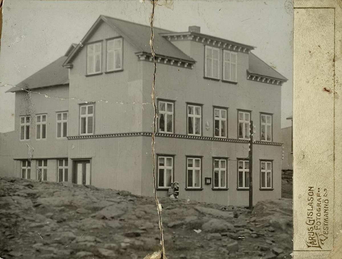 Myndin sýnir stórt og reisulegt timburhús á þremur hæðum. Fyrir framan húsið, nálægt einu horninu stendur kona með barn í fanginu. Símastaur er staðsettur fyrir framan mitt húsið.