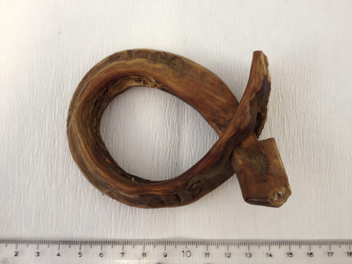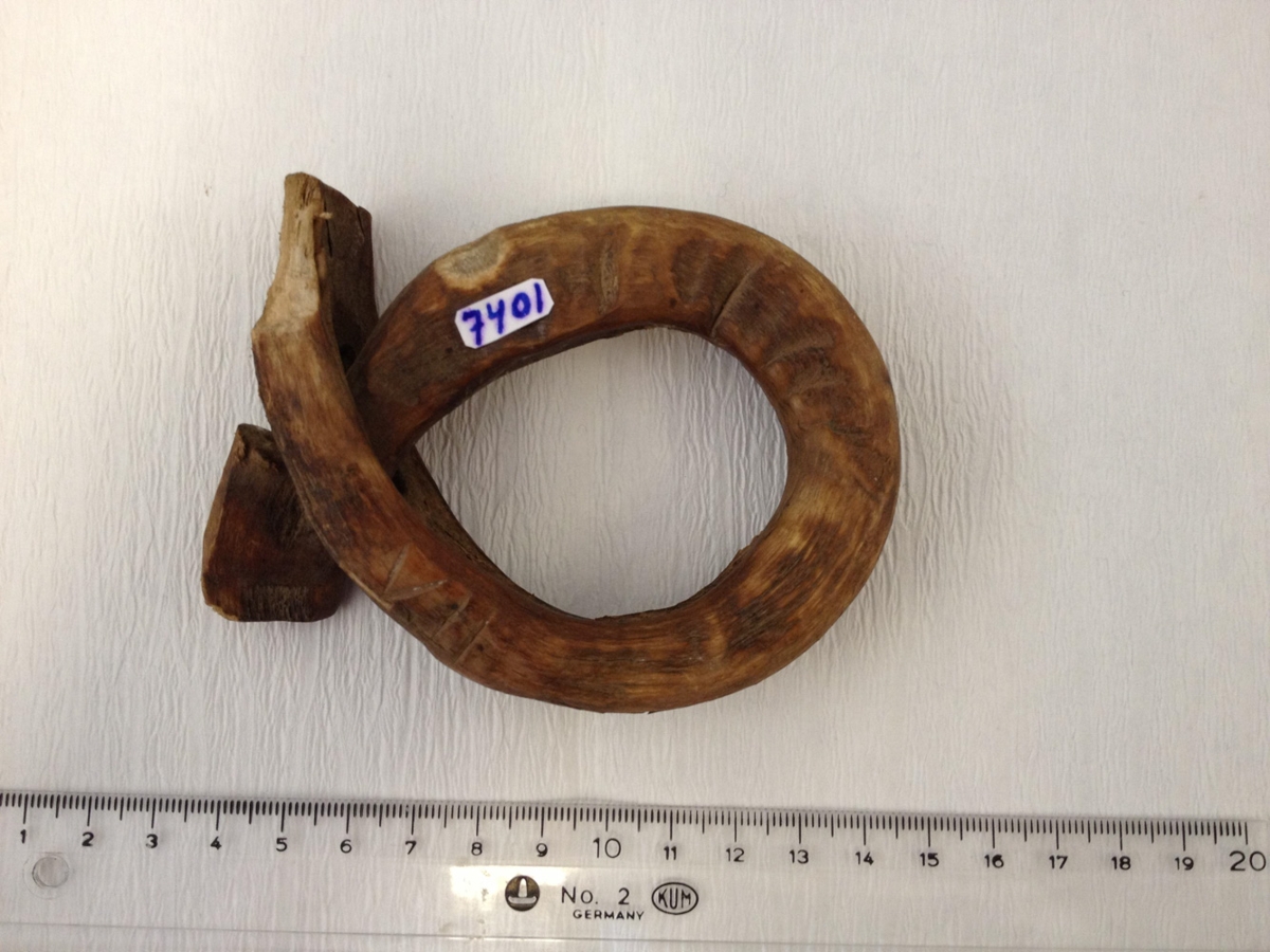 Hornhögld, er úr hrútshorni, svonefnd gift högld eða hringhögld, 10 x 7,5 cm. Fjórar merkingar, Bjóla, St.B, VII og búmark. Er úr búi Stefáns Bjarnasonar á Bjólu afa Guðrúnar, VII mun eiga að merkja G, hér er miðað við a, á, b, o.s.frv. = Guðmundur, G 7. stafur í stafrófi. Búmark Sighvats Einarssonar í Skálakoti, d. 1846. Frá honum: Einar Sighvatsson á Ysta-Skála, Einar Einarsson á Bjólu (d. 1900), Áslaug Einarsdóttir á Bjólu. SIgurlín Stefánsdóttir. Þau Ægisíðuhjón, Guðmundur og Sigurlín notuðu búmarkið á alla lausahluti á búi. Þvottaklemmur Sigurlínar með búmarki eru í Skógasafni.