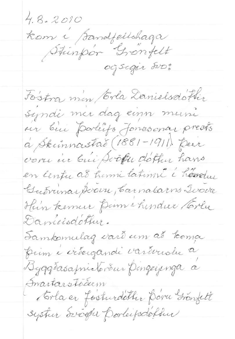 Í bréfi sem fylgi kaleiknum skrifar Steinþór Grönfelt: "Fóstra mín Erla Danielsdóttir sýnd mér dag einn muni úr búi Þorleifs Jónssonar prests á Skinnastað (1881-1911). Þeir voru úr búi Svöfu dóttur hans en lentu að henni látinni í höndum Guðrúnar Svövu, barnabarns Svöfu. Hún kemur þeim í hendur Erlu Daníelsdóttur. Samkomulag varð um að koma þeim í viðeigandi varðveislu á Byggðasafn Norður-Þingeyinga á Snartarstöðum. Erla er fósturdóttir Þóru Grönfelt systur Svöfu Þorleifsdóttur.