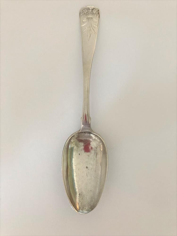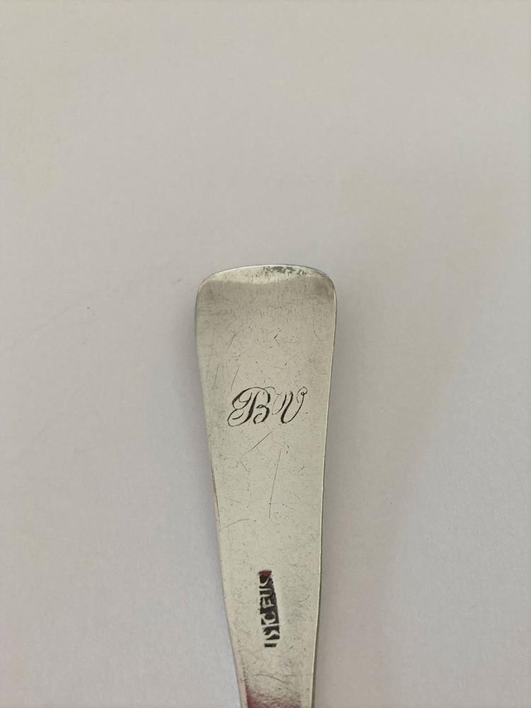 Matskeið úr silfri, merkt á baki B.V. Stimpill JSIGFÚS. Þetta er verk Jóns Sigfússonar gullsmiðs frá Hofteigi, bónda á Hreimsstöðum, f. 1815, d. 1882. Jón lærði hjá Þorgrími Tómassyni á Bessastöðum, síðar í Kaupmannahöfn. Kom þaðan 1843 (upplýs. Þór Magnússon). Þetta er matskeið Björgvins sýslumanns sem var fæddur 1825. Er að öllu hinn mætasti gripur. Hugsanlega tannfé.