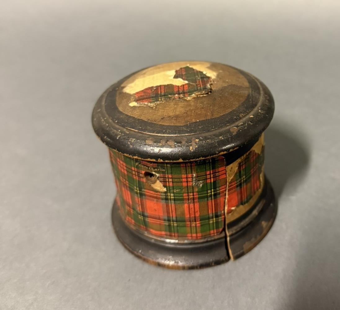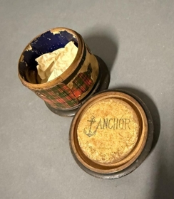 Rennd, kringlótt tréaskja, með áfelldu loki. Þvermál 8 cm, hæð 6,5 cm. Skrautpappír er límdur á hana að utan og á lok. Nú skemmdur til muna.