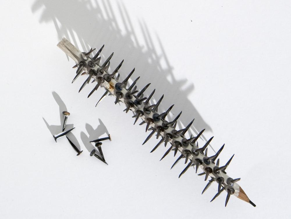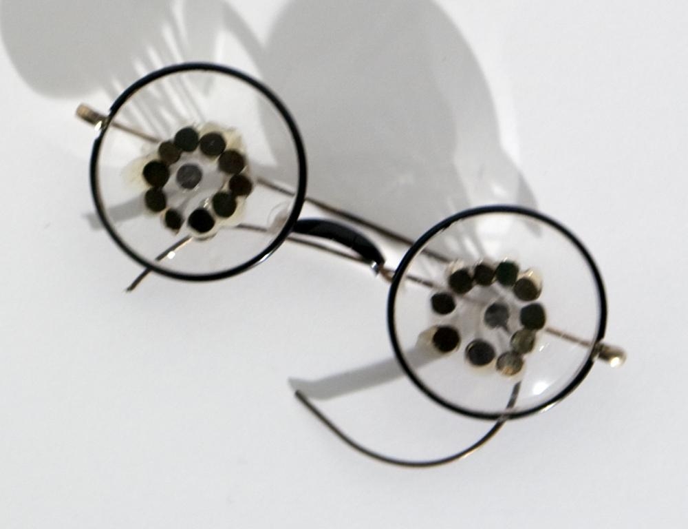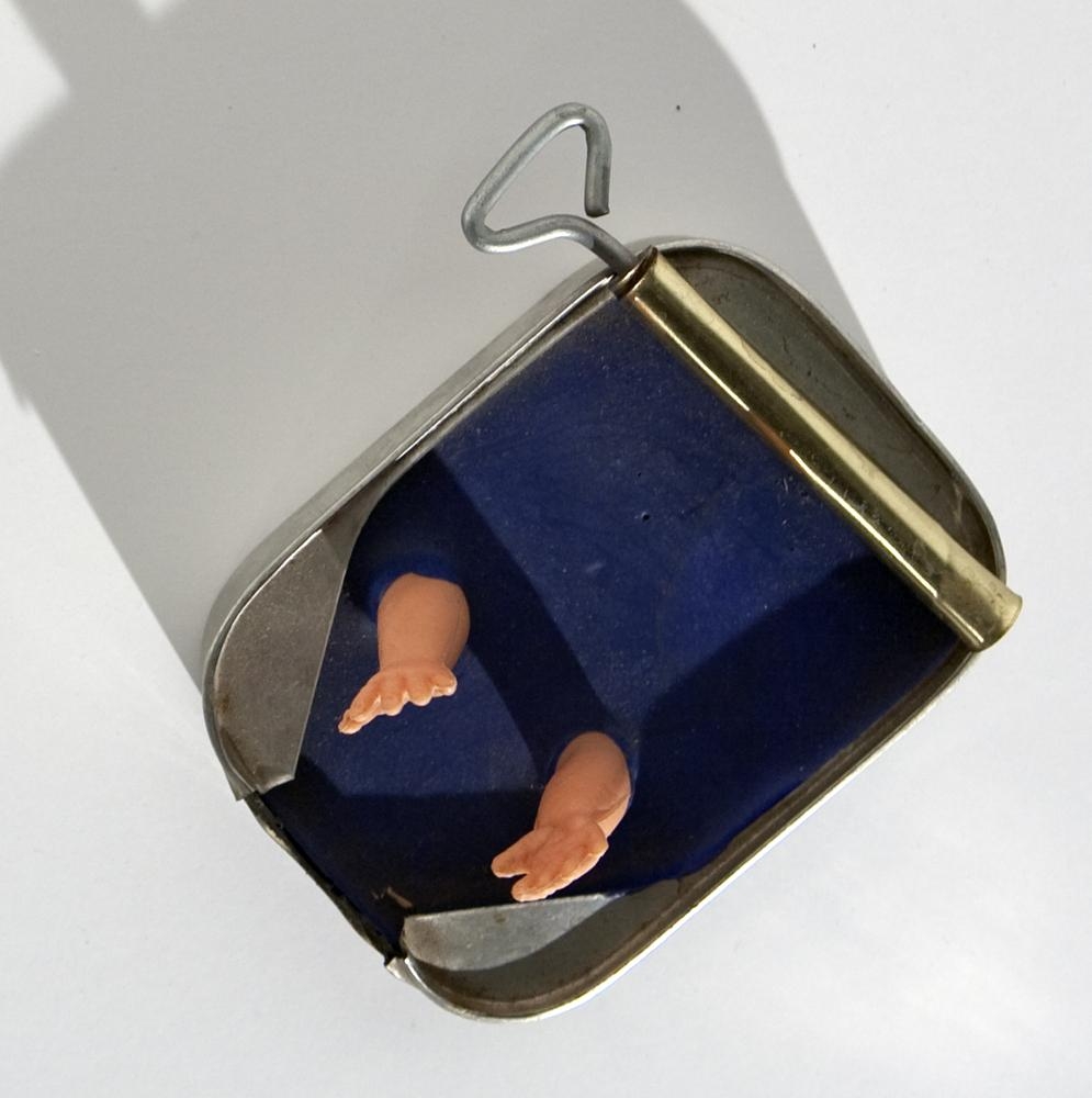 Þrjár einingar, gleraugu, blýantur, sardínudósGleraugu: hringlaga gler í mjórru málmumgjörð. Á hvoru gleri er einn nagli í miðjunni, 10 nöglum raðað í hring í kringum þann í miðjunni. Naglinn í miðjunni snýr út en hinir inn - í átt að augana ef gleraugun eru sett upp. Naglarnir límdir á með glæru lími. Blýantur. yddaður, svörtum nöglum raðað skipulega og þétt allan hringinn utan um blýantinn.Sardínudós: Opin með sardínudósarlykli. Dósin er fyllt með þykku bláu efni og úr því koma tvær litlar hendur úr plasti - hendur af dúkku.
