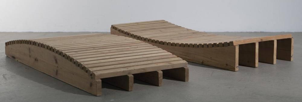 Tveir viðarskúlptúrar - eiga það sameiginlegt að hafa fjórar ferhyrntar spýtur í grunninn, 31 þunnri spýtu raðað þar ofan á. Báðum einingunum er raðað í bogadregna línu, önnur beygist upp en hin niður (speglast). Einingarnar minna á litlar göngubrýr.
