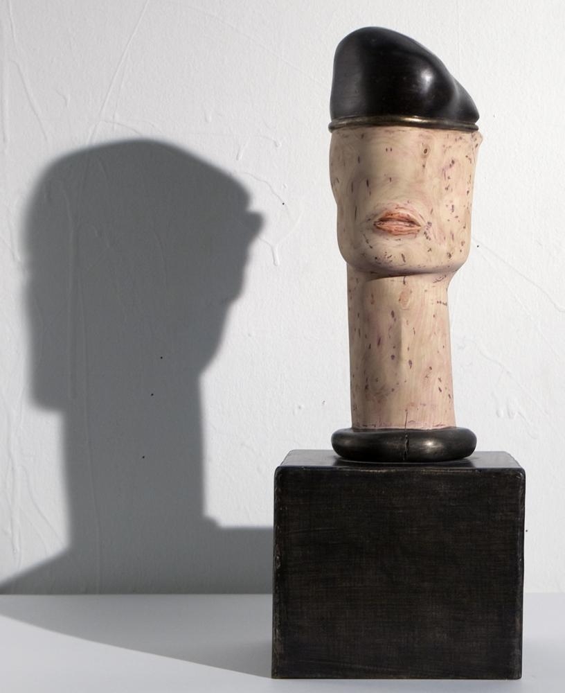 Haus með langan háls, gerður úr við og fest á kopar. Höfuðið er með lítinn munn en ekki með nef eða augu og aðeins eitt eyra (vinstramegin, næstum því á hnakka höfuðsins). Háls og höfuð máluð í ljósbrún/bleikum húðlit með fjólubláum blettum - sést í viðinn í gegnum málninguna. Munnurinn aðeins rauðari en höfuðið. Höfuðið er með svarta alpahúfu, gyllt rönd neðst á húfunni.