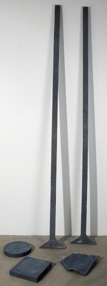 Tvær langar stangir með litlum þríhyrningum á öðrum endanum, hringur, ferningur og óreglulegur ferningur - allt gert með tini. Tin hylur annars vegar kork og hins vegar viðarspýtur, óreglulegi ferningurinn er aðeins tilplata en hylur ekki neitt. Sést í undirlagið í gegnum tiniðVar á sýningu Árna, vantar 6. eininguna sem var gulur hringur, gerður úr pappa.