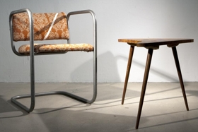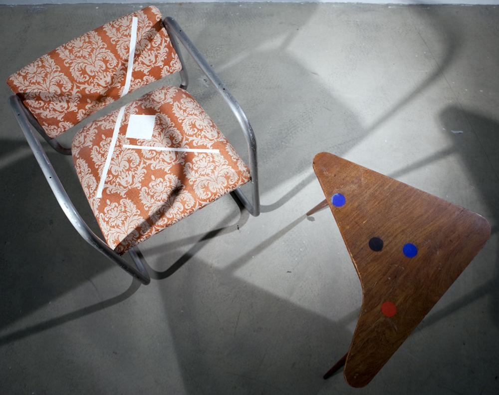 Stóll: settur saman af beygðum málmhólkum sem halda uppi setu og baki. Bak og sessa eru bólstruð með rauðu efni, með barokk-mynstri. Á bakið er máluð hvít skálína sem teygir sig á setuna en þar er einnig hvít málaður ferningur. Borð: þrír fætur og spónaplata með tekkspóni, borðplata minnir á þríhyrning en línurnar eru mjúkar, engin oddhvoss horn. Á plötunni eru 4 hringir; 2 bláir, 1 svartur, 1 rauður.