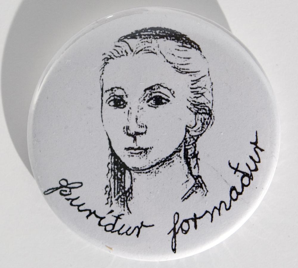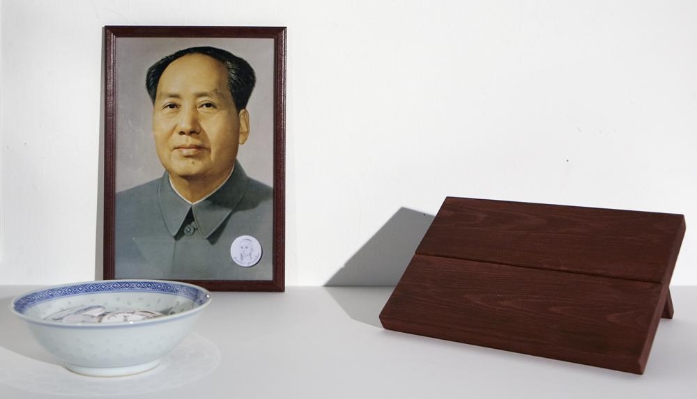 Innsetning sem samanstendur af viðarhillu, ljosmynd af Mao með hvítt barmmerki, postulíns sjál með bláu asísku munstri og barmmerki ofan í skálinni. Brúnbæsuð viðarhilla (skrúfur fylgja með til að festa á vegg). Skálin með barmmerkjunum á að vera á hillunni og ljósmyndin af Mao með barmmerkið á að vera fyrir ofan skálina. Á barmmerkinu er svört teikning af ungri komu með skotthúfu og fyrir neðan hana stendur 'Þurríður formaður'. Mao er með merki Þurríðar í barminum. Í skálinni eru alls 14 barmmerki.
