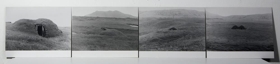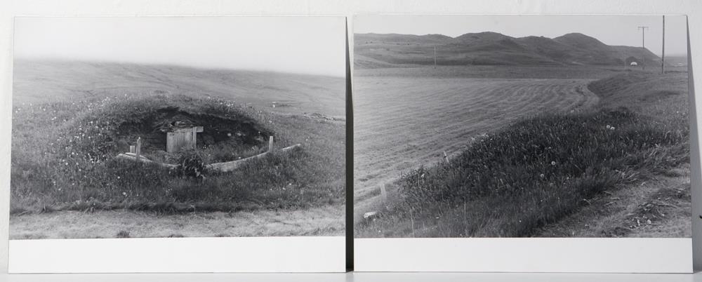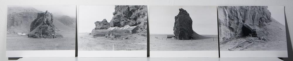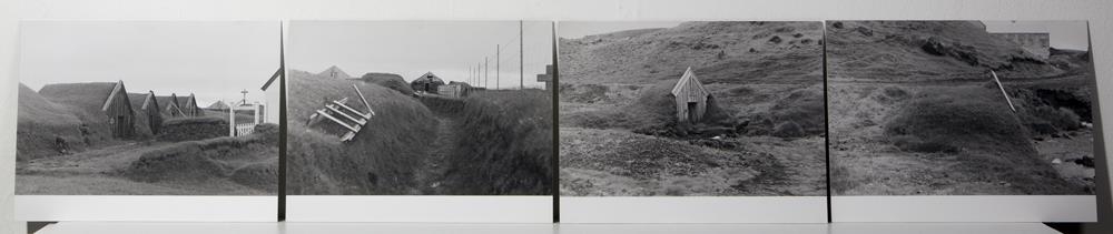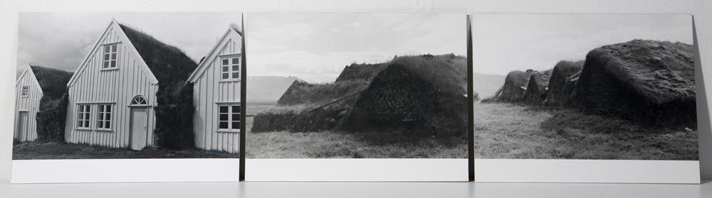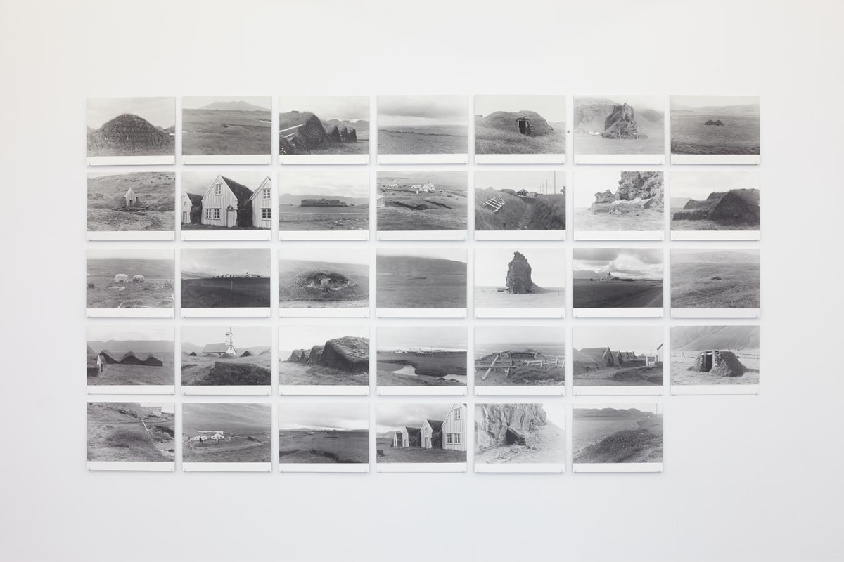 34 svarthvítar ljósmyndir, hver og ein límd á þunnar álplötur. Myndefnið er af gömslum íslenskum vistaverum, sbr. torfbæirMiðar aftan á verkum - stikkorð og tölustafir, sennilega hvar myndirnar eru teknar.