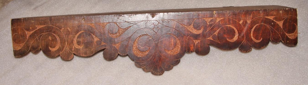 Hilla úr krossvið. L. 74 cm, d. 15,5 cm, br. niður 16 cm. Fallega útskorin að neðan í bylgjum og á framhlið í fallegu mynstri. Dálítið upplituð öðru megin.