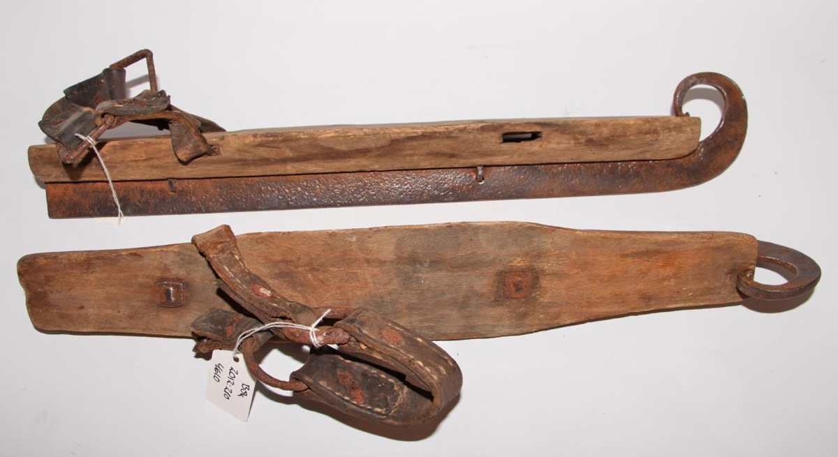 Skautar úr tré, járni og leðri. L. 38 cm, br. 6 cm. Breidd er mest í miðju en mjókka svo fram og aftur. Á báðum skautum er fremri reimin farin, en sú aftari enn til staðar.