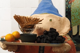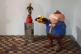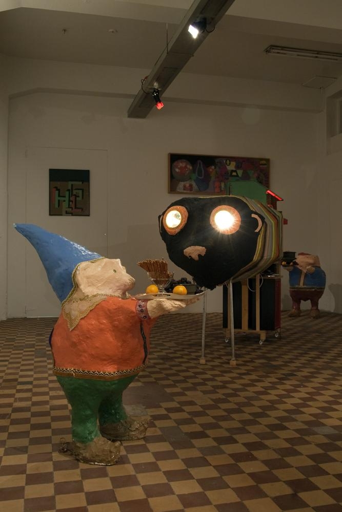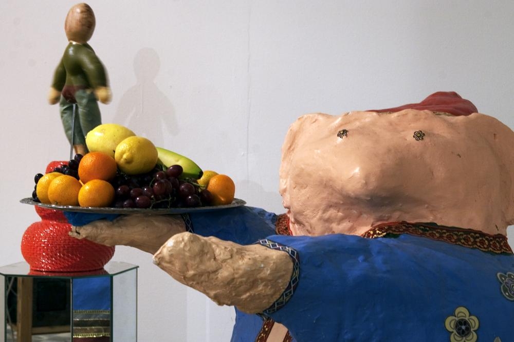 Tveir skúlptúrar, fígúrur í ætt við stóra garðálfa. Þeir halda á bakka. Bjóða ávexti, vínber, epli, ferskjur, súrar gúrkur... eitthvað slíkt. Gestir geta fengið sér smakk. Baldwin og Ísak Baldvin eru saman. Tvær fígúrur, eitt verk.