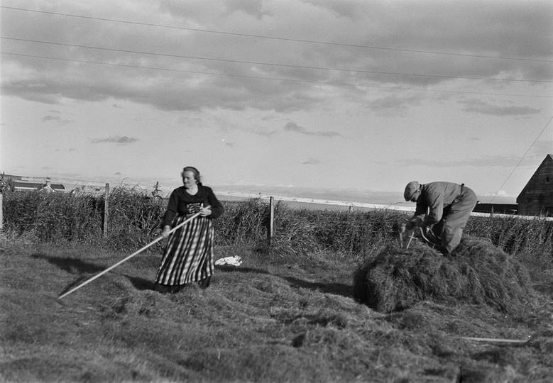 Í heyskap eru Margrét Jónsdóttir (1891-1956) og Níels Kristmannsson (1892-1971) frá Níelsarhúsi (Vesturgötu 10).