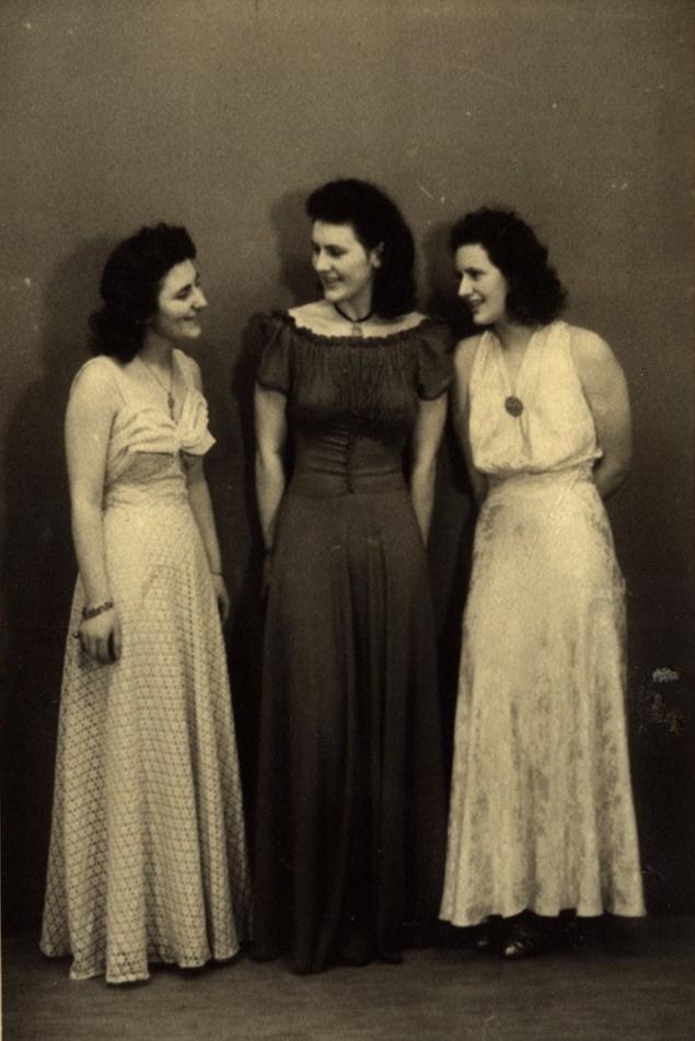 Systurnar Auður, Ásdís og Fríða Sveinsdætur stilla sér upp í kjólum.