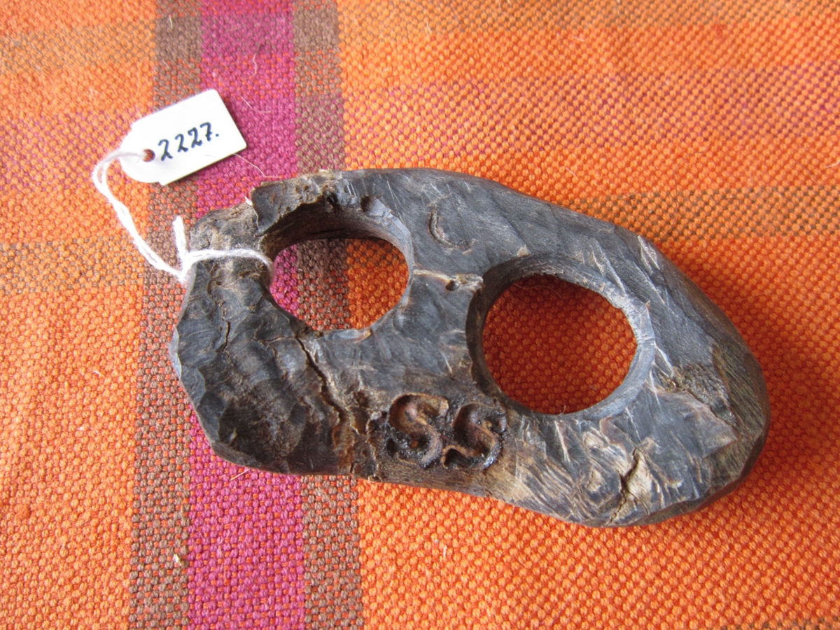 Högld úr dökku horni með tveimur götum, brennimark SS, lengd 10 cm. Úr eigu Sigurðar Sigurðssonar Skjeljabrekku.