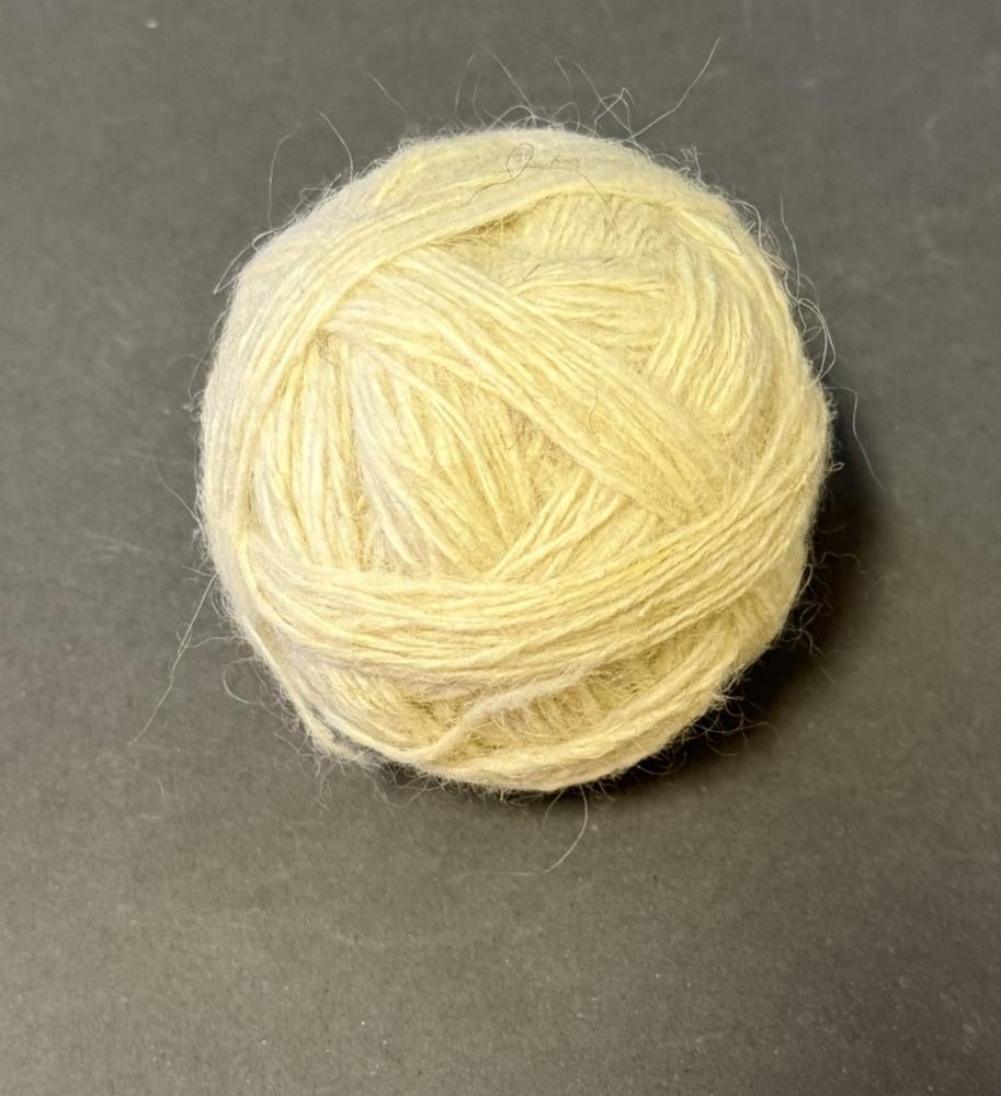 Hvítur bandhnykill. Ásgeir Auðunsson frá Minnivöllum táði ullina og spann á halasnældu árið 1951. Undið á sauðarvölu. Gjöf Ásgeirs. Hann býr á Hellu, nú 90 ára.