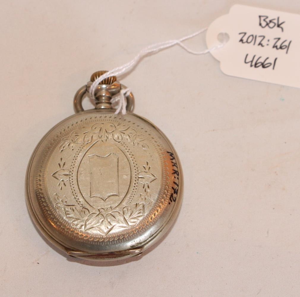 Vasaúr úr ljósum málmi þv. 4,7 cm, þ. 1,4 cm. Innan í baki er nr. 889641 og IJ106621F. Úthlið bakhliðar er flúruð með einhverskonar ramma í miðjunni. Úrhliðin/framhliðin er með hvítum bakgrunni sem á eru rómverskir tölustafir frá I-XII, strik eru á milli fyriri hverja mínutu. Neðst er hringur fyrir sekúnduvísi en þar eru tölurnar 10, 20, 30, 40, 50 og 60. Strik er fyrir hverja sekúndu. Vísarnir eru koparlitir. Á úrið hefur verið fest keðja nr. MKR 766 eða BSk 2012-262 - 4662.