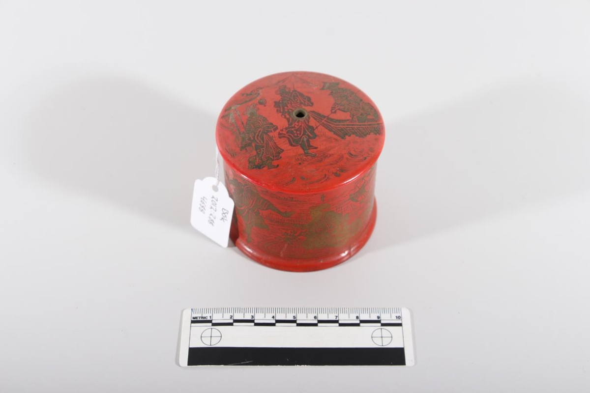 Baukur úr tré. H. 6,8 cm, þv. 8 cm. Rauður á litinn með gylltum kínverskum myndum á hliðum og loki. Á lokinu er gat með messing hring. Ofan í þennan bauk voru garnhnyklar settir og endinn þræddur upp í gegnum lokið. Þá var hnykillinn ekki á fleygiferð.