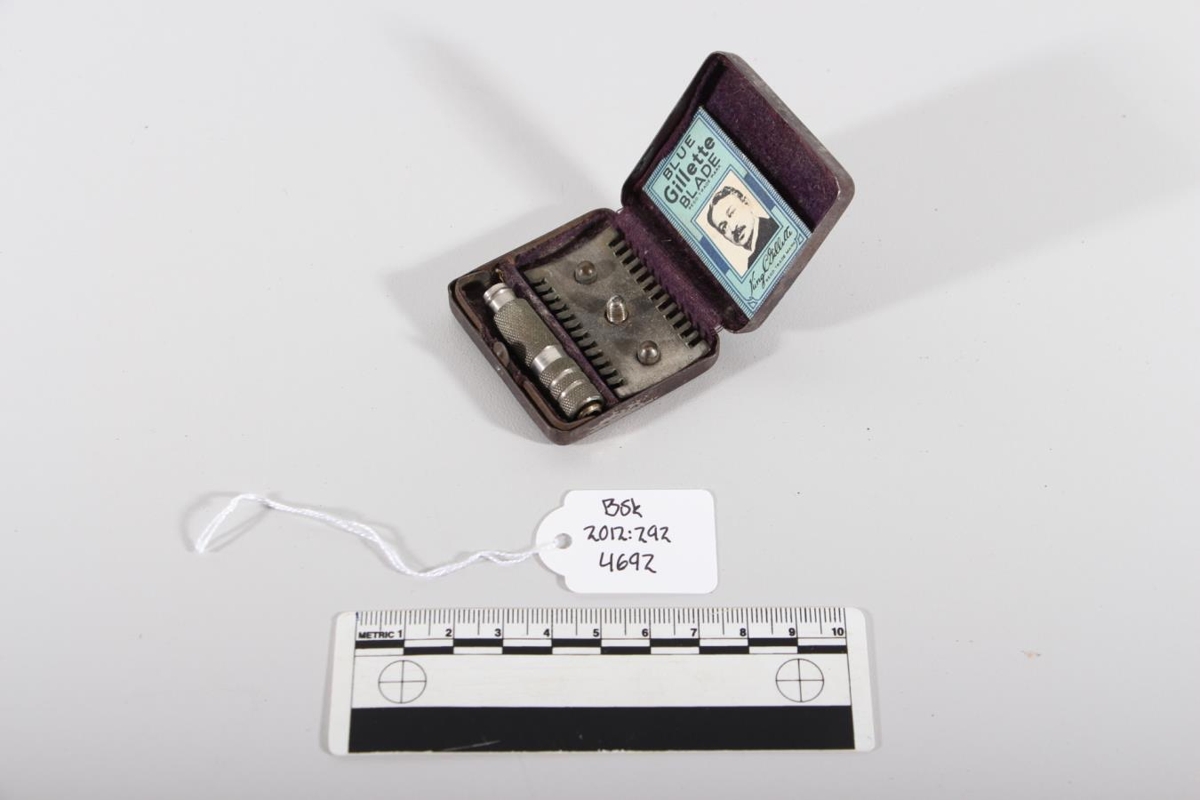 Rakvél úr málmi. Í kassa sem er 4,5 x 4,6 x 1,3 cm á stærð.