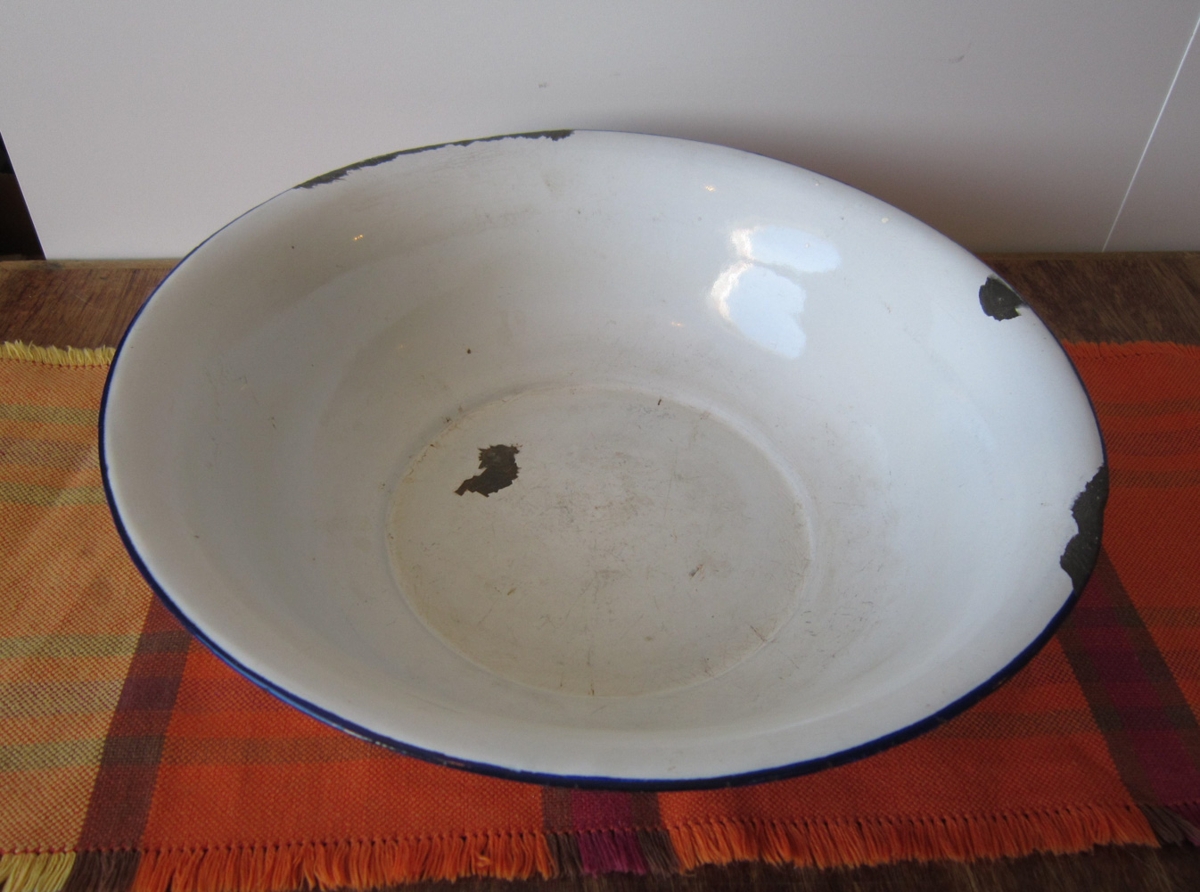 Hvítt emalerað vaskafat með blárri rönd á barminum, þvermál að ofan 34 cm. Hluti af vaskasetti 2248/2249.