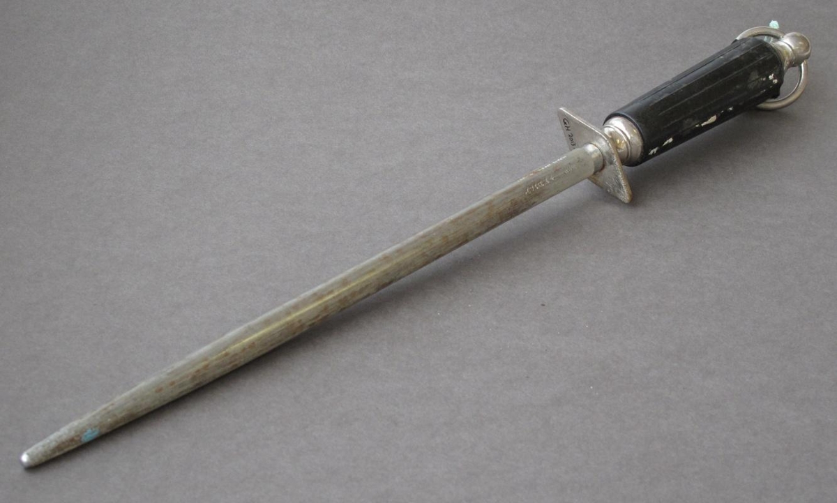 Brýni Ásgeirs. Stórt úr stáli með svörtu plasthandfangi. Hringur á handfanginu með vöfnu ljósgrænu reipi með lykkju. Made in Germany. Stálið farið að ryðga og þarf forvörslu.