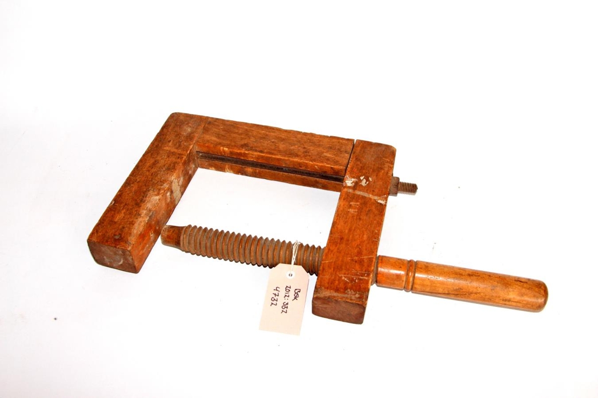 Þvinga úr tré. Lengd 39,5 cm. Breidd 18,8 cm. Ramminn er boltaður saman með járnbolta sem festur er á með flugu. Handfang er rennt. Upphafstafirnir ÁÁ eru þrykktir í aðra hliðina.