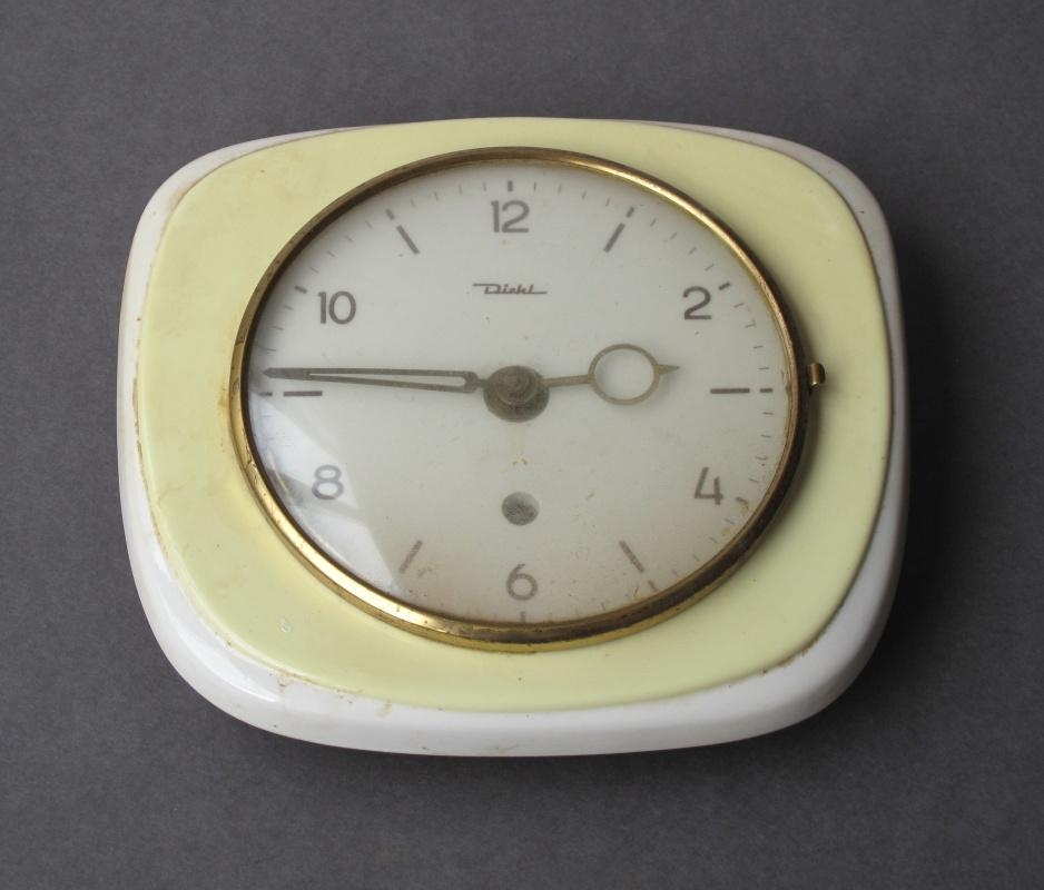 Eldhúsklukka Ásgeirs. Gul og hvít postulínsklukka með opnanlegum glerkúpul.