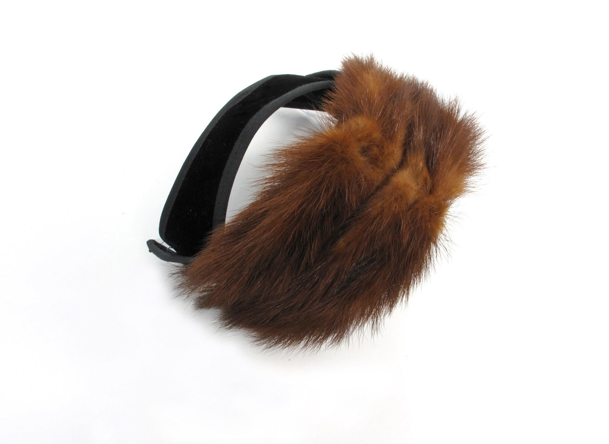 Kvenhattur. Hattur eða spöng klædd svörtu flaueli og földuð á köntunum með svörtu efni. Spöngin skiptist í tvennt, einn hlutinn liggur þvert yfir aftanvert höfuðið og hinn hlutinn þvert á framanvert höfuðið. Hlutirnir koma saman í kross á hliðunum og enda í spíssa sem vísa fram og aftur. Fremri hlutinn er klæddur með rauðbrúnum loðskinni (e.t.v. af tófu eða mink). Ómerktur. Sennilega frá 1940-1960.