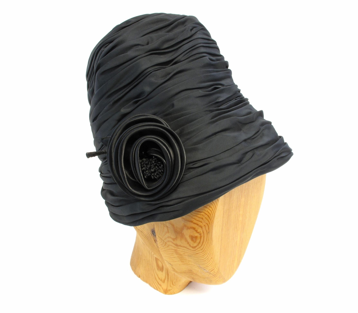 Kvenhattur. Svartur kollhár hattur með lóðréttar hliðar. Úr fínu þéttofnu efni og það er látið mótast í krumpur eða fellingar allan hringinn frá toppi niður á brún. Framan á hægra megin er rós úr svörtu satíni. Svartir fræflar ásamt stilk og tveimur blöðum sem einnig er svart. Fóðraður að innan með sama efninu. Brún teygja til að festa við höfuðið, slitin öðru megin. Merktur að innan með vélútsaumuðum miða: Modellhüte, Ernst v. Spreckelsen jr. Ballindamm 36. Þýskur, sennilega frá 1950-1960.