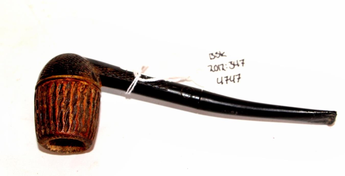 Pípa úr plasti, tré og messing. L. 14 cm. Þv. 2,5 cm. Gerðin er Dollar Sweden. Munnstykki er mikið nagað.
