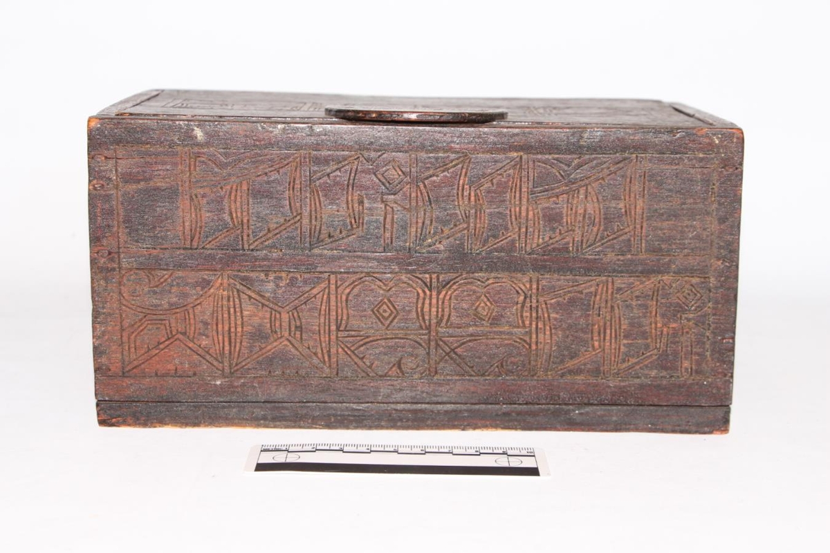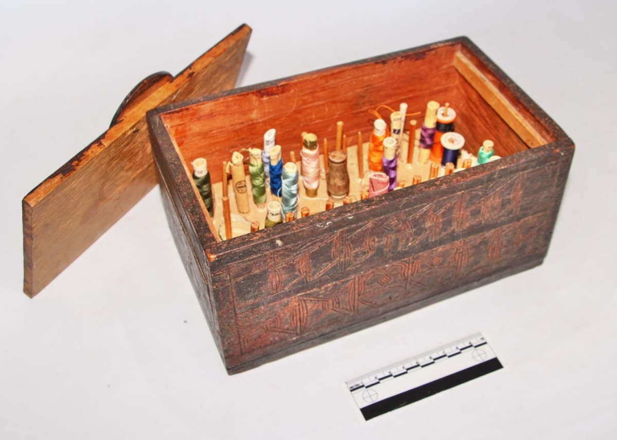 Saumakassi úr tré. H. 11,5 cm. Br. 24,3 cm. D. 14 cm. Á hliðum kassans er nafnið Sigríður Árnadóttir skorið með höfðaletri, en á annan gaflinn er skorinn fæðingardagur hennar og ár, 7/4 1905 og á hinn gaflinn er skorin út vísa með rúnaletri sem hljómar svona: "Lítið hendir láu né prís, list frá landi og sveðju, vigra hendir vefjadís, vinar sendir kveðju". Á lokinu er svo ártalið 194?.