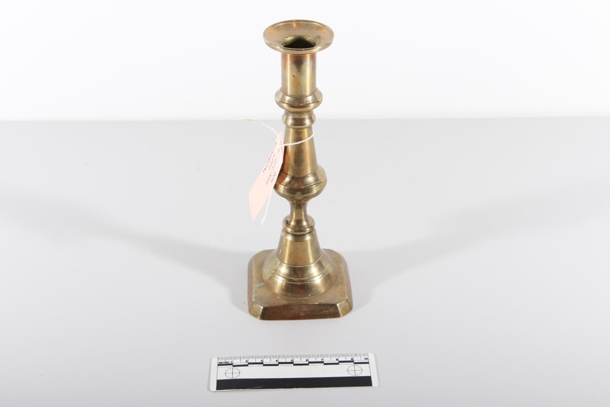 Kertastjaki úr bronsi. H. 20 cm. Br. fótur 7,5 x 7,5 cm. Renndur en er samsettur úr tveimur hlutum.
